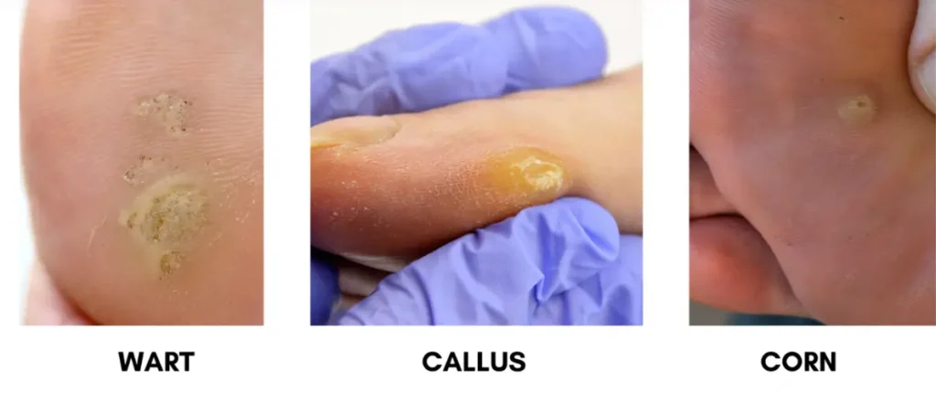 ক্যালাস: ক্যালাস মোটা, শক্ত ত্বক যা সমতল এবং সাধারণ ত্বকের মতই বড় এলাকায় ছড়িয়ে থাকে। কড়ার মতো, এটি বারংবার ঘর্ষণ বা চাপের কারণে হয়।